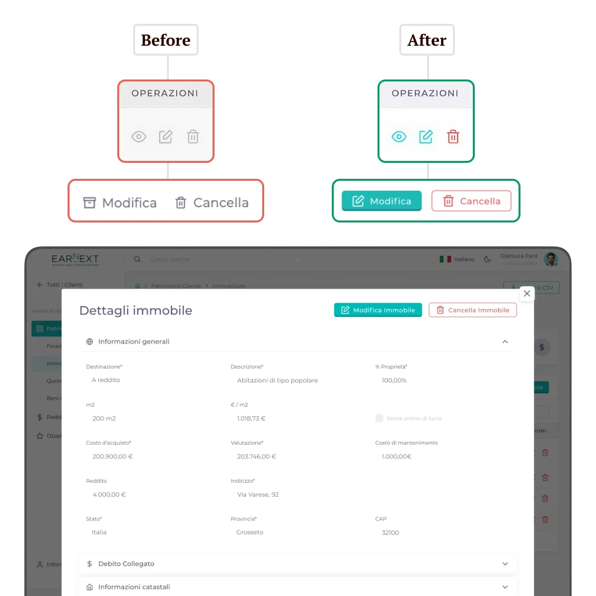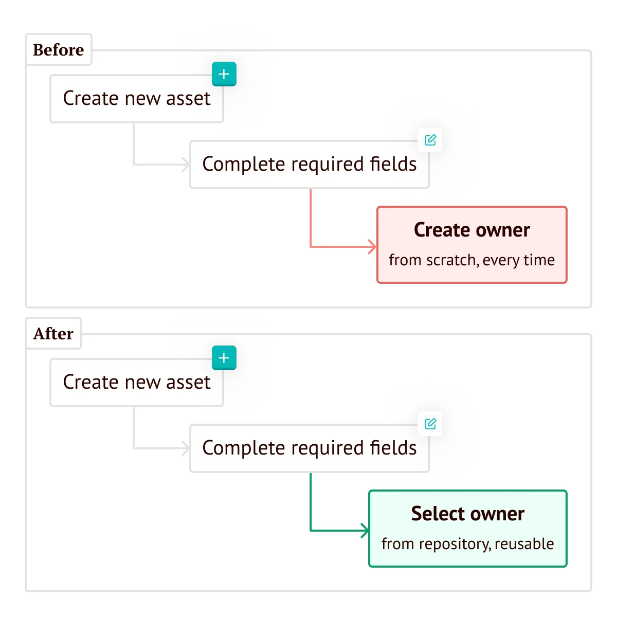 Destructive actions were visually identical to non-destructive ones, with no prior warning. Users were also required to re-enter owners' information from scratch every time a new asset was added.
