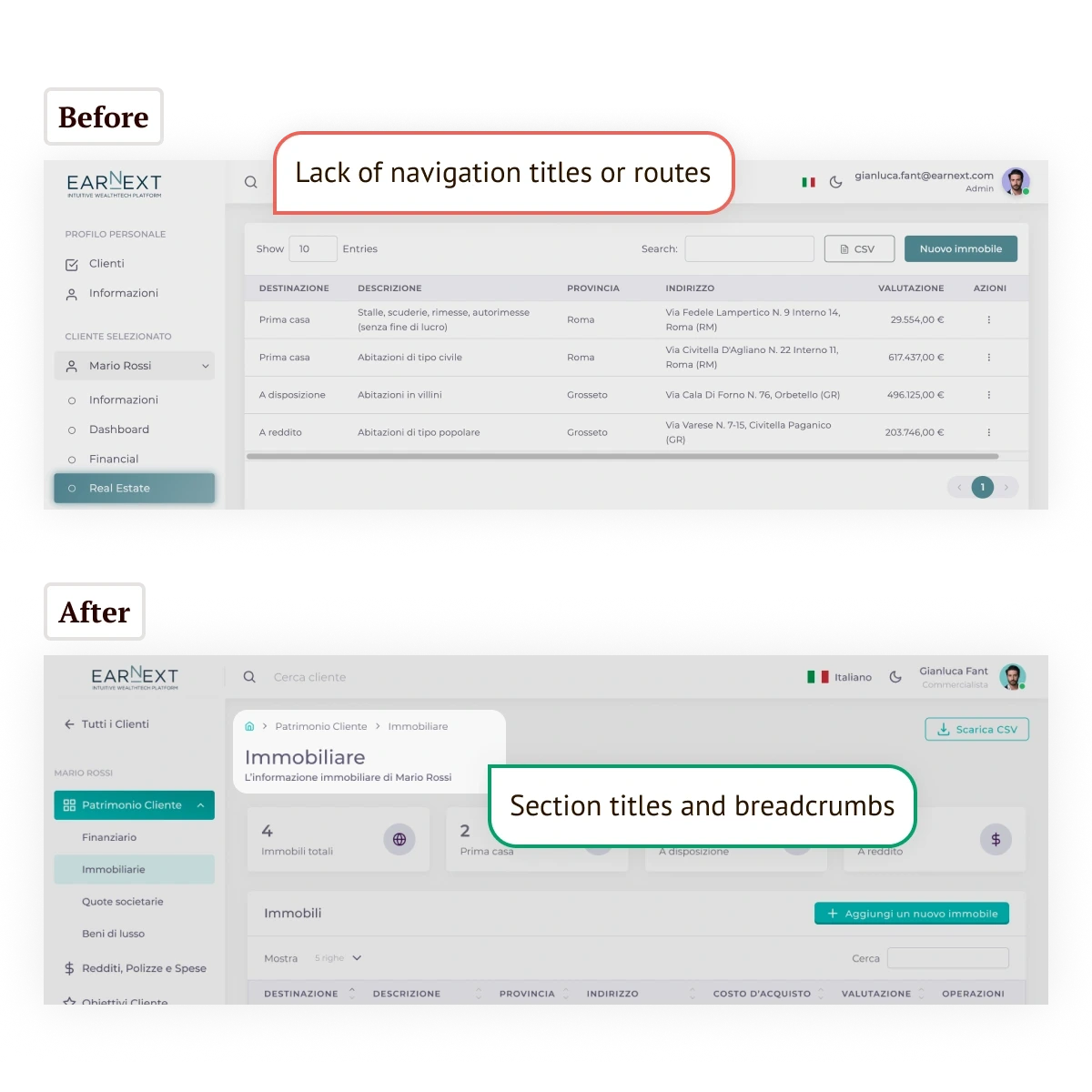 Earnext is a wealth management platform that aggregates, analyzes, and simplifies complex financial data for wealth managers and their clients. Creative Bulls was engaged to audit and improve the platform's usability, both the client-facing interface and the admin environment.