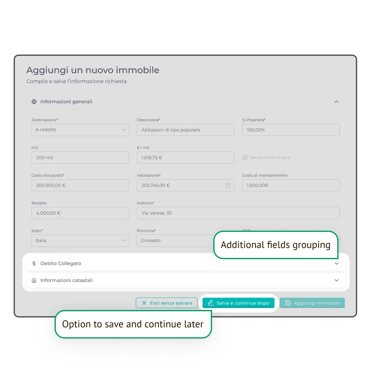 Enabled flexibility in logging complex wealth assets through a save-and-continue flow and a centralized contacts repository, allowing quicker selection of asset owners when applicable.